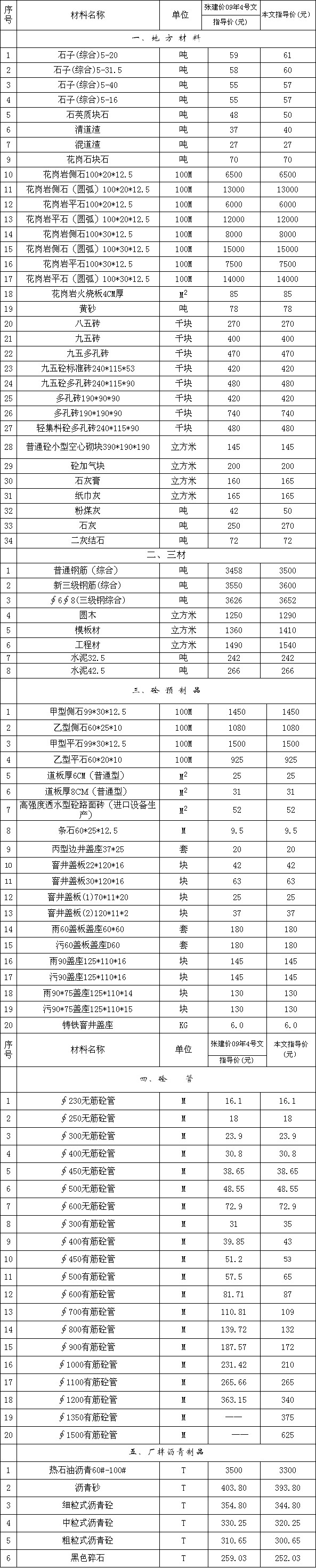 根據市場價格變化和現場采價,結合蘇州市建設局蘇建價〔2009〕7號文精神,經研究,決定調整建設工程材料指導價格。本次調整的價格從2009年5月1日起執行,具體指導價格詳見附表。