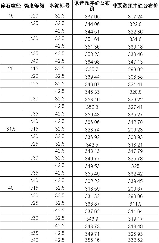 注:1、本公布價已包括泵送需要所添加的外加劑費用,實際采用的外加劑不同,不調整;但防水、抗滲、抗裂等功能性的外加劑費用應另行計算。