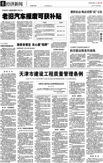 《天津市建設工程質量管理條例》已由天津市第十五屆人民代表大會常務委員會第二十五次會議于2011年7月6日通過,現予公布,自2011年9月1日起施行。
