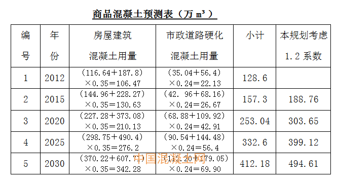 第十二條 預(yù)拌混凝土需求總預(yù)測(cè)。預(yù)拌混凝土需求預(yù)測(cè)考慮適度競(jìng)爭(zhēng)的原則,其預(yù)測(cè)總量考慮1.2系數(shù),計(jì)算結(jié)果見下表。