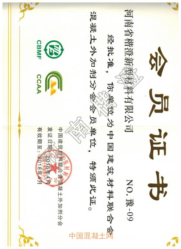 | 發(fā)證機(jī)構(gòu): | 中國(guó)建筑材料外加劑分會(huì) | 發(fā)證時(shí)間 : | 2016-04-01 |