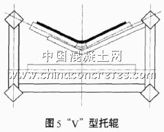 為防止膠帶跑偏,減輕重量,布料機專利將布料膠帶機最前一節桁架托輥設計為“V ”自定心托輥(圖5 ),對膠帶起自動調心作用。