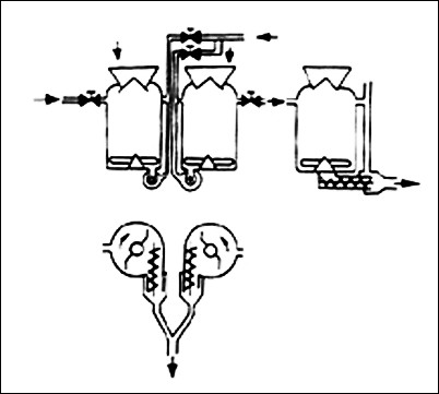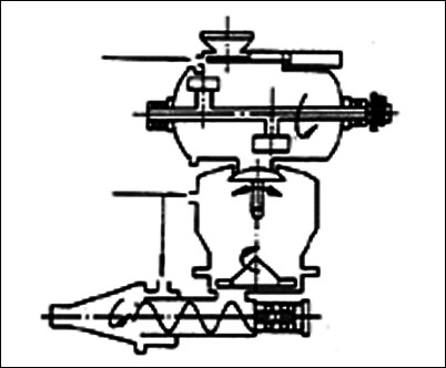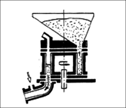 是日本德斯古馬恩型濕噴機工作原理圖。該濕噴朵為豎立的兩個罐,上罐拌料,下罐噴射,上下罐均有密封閽門,交替開啟,關閉,以實現連續噴射。下罐底部有一橫臥螺旋驅動濕拌和料至料管內噴射出去。這種濕噴機的缺點 是上料高度大。比較笨重。