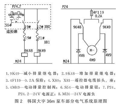 泵車在工作中,突然發現有線遙控器上的電動排量鈕S54失靈,系統只能小排量泵送,系統部分原理圖如圖2所示。將機械手動油門控制在高位,泵送排量也無明顯增加。檢查后發現4F119保險燒斷,更換后其它功能都正常。當操作遠控器上的電動排量鈕S54時,4F119保險再次燒斷,且排量還是無變化。