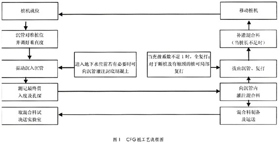 CFG樁(振動沉管法)施工工藝,單打法是最基本的工法。分為移機就位、沉管造孔、填料加密和成樁四道工序,其中分層填料加密是關鍵工序。其工藝流程如下圖。