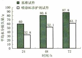 混凝土裂縫產生的一個重要原因就是由于混凝土內部水分損失引起的干燥收縮,因此,保水性是反映養生防裂劑的重要性能之一。我們按照前述方法各成型基準和噴涂養生防裂劑混凝土試件 4 組,成型后放入烘箱中養護—定時間,并測試混凝土的水分損失量,以評價養生防裂劑的保水性。烘箱溫度 38 ℃ 時試件平均水分損失量比較見圖 1 。