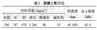 P.O42.5 水泥;中粗砂,細度模數2.5~3.1 ;5~25mm連續粒級碎石; Ⅱ級粉煤灰,燒失量7 % ,需水比103 %;SP401 高效減水劑,減水率20 %。