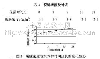在上面的試驗中管片沒有裂縫,但為確定水養護對管片開裂的趨勢的影響,又做了這樣的試驗:取25塊管片,在蒸養階段進行迅速升溫和迅速降溫的極端處理,增加管片的開裂傾向,然后將管片分成5 批,每批5 塊,分別進行不保濕、保濕3 d、保濕7 d、保濕15d、保濕28 d 的養護,然后放置在相對濕度為(45 ±5) %的車間,進行自然養護,累計60 d 后檢查管片的裂縫情況,發現所有管片的外弧面均出現了樹枝狀的干縮裂縫,裂縫寬度為0.04 mm 左右,裂縫密度統計結果見表3。