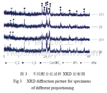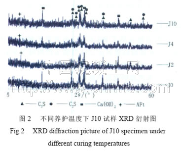 ( 2) 在65℃蒸汽養(yǎng)護(hù)制度下, J10 試樣XRD 圖譜同時(shí)出現(xiàn)AFt 和AFm, 在外界條件的變化下, 由于晶型轉(zhuǎn)化而出現(xiàn)延遲AFt 現(xiàn)象會(huì)導(dǎo)致體積膨脹引起管片開裂, 因此蒸汽養(yǎng)護(hù)溫度不宜超過65℃; 在55℃蒸汽養(yǎng)護(hù)制度下, J2 試樣XRD 圖譜同時(shí)出現(xiàn)AFt 和AFm, 考慮到脫模強(qiáng)度和延遲AFt 的潛在危害, 因此蒸汽養(yǎng)護(hù)溫度不宜低于55℃。