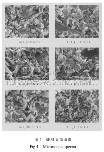 Ca(OH)2 的生成。膠凝礦物水化產(chǎn)物中Ca(OH)2 含量越少越有利于膠凝礦物水化產(chǎn)物結(jié)構(gòu)的緊密, 對(duì)混凝土的強(qiáng)度及耐久性均有改善作用。同時(shí)加入礦粉, J2、J4、J10 均出現(xiàn)AFt 衍射峰, 說明加入礦粉后,CaO 的水化產(chǎn)物趨向于由Ca(OH)2 向AFt 的轉(zhuǎn)化。對(duì)蒸汽養(yǎng)護(hù)升溫時(shí)間采用3- 3- 3- 2 方式、恒溫溫度分別為55℃、60℃、65℃、70℃的J10 組試樣做XRD 分析, C3S、C2S 的存在說明在55~70℃蒸汽養(yǎng)護(hù)制度下, 11 個(gè)小時(shí)的蒸汽養(yǎng)護(hù)并未使膠凝組份充分水化, 仍有大量的膠凝礦物處于未水化狀態(tài)。55℃時(shí)Ca(OH)2 衍射峰、C3S 衍射峰、C2S 衍射峰都較強(qiáng), 并有較明顯的AFt 衍射峰( 0.9718 nm) ( 圖2)。對(duì)試樣的Ca(OH)2 做定量分析, 55℃ 試樣中Ca(OH)2 含量為10%, 60℃試樣中Ca(OH)2 含量為9%, 65℃試樣中Ca(OH)2 含量為7%, 70℃ 試樣中Ca(OH)2 含量為11%。Ca(OH)2 含量的定量分析說明, 不同恒溫蒸汽養(yǎng)護(hù)制度下, 試樣Ca(OH)2 生成量不同, 65℃時(shí)試樣的Ca(OH)2 含量相對(duì)較少, 混凝土的脫模強(qiáng)度也相應(yīng)較高, 但同時(shí)出現(xiàn)較明顯AFt 衍射峰( 0.9804 nm) 和AFm 衍射峰( 0.8014 nm) 。AFt和AFm 同時(shí)存在可能引起晶型轉(zhuǎn)變對(duì)體積穩(wěn)定性