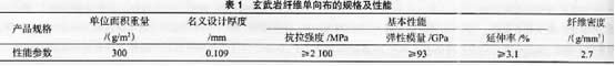 水泥選用P·0 32.5級水泥;粗骨料為最大粒徑25 mm的卵石,含水率0.244%;細骨料為細度模數為2.22的河砂。外加劑選用江西省創新外加劑有限公司生產的聚羧酸鹽高效減水劑LCX-9,摻入量為水泥質量的0.5%;玄武巖纖維單向布由浙江得邦高技術纖維有限公司生產,其規格和性能如表1所示。試驗采用的黏結膠水為湖南固特邦土木技術有限公司生產的JN—C碳纖維加同專用膠。