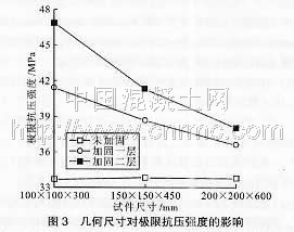 的極限抗壓強度提高幅度分別為22.61%、12.28%、8.34%;二層約束素混凝土方柱的極限抗壓強度較未約束的素混凝土方柱相比有了明顯的提高,3種尺寸的極限抗壓強度提高的幅度分別達39.02%、22.03%、12.46%。