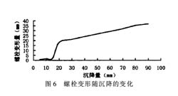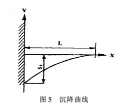 此時假設沉降曲線如圖5.在這種情況下,豎井的剛度遠大于隧道剛度,可視其為固端。假定不均勻沉降模式為:δ(x) =-δ0e-αx沉降以向上為正,彎矩以使隧道下部受拉為正。同樣以上述工程為例,在假定沉降模式下,隧道在5m的沉降范圍內,隨著沉降量的增大螺栓張開量的變化情況如圖6所示。在沉降量比較小時螺栓尚處于彈性階段,當超過螺栓的彈性極限沉降量時,螺栓的變形量有一個突變,隨后又比較平穩的變化,此時螺栓已進入塑性階段,張開量很大,已達不到防水要求,所以在設計時必須保證螺栓始終處于彈性階段。從圖中可以看出,當沉降范圍為6m,隧道豎井處發生3cm突沉時,螺栓將被拉開20~30mm,即隧道的接頭處明顯開裂,螺栓拉斷,端部受壓混凝土被壓碎,這與黃海1985年地震時,打浦路越江隧道與豎井交接處的開裂破壞相似。