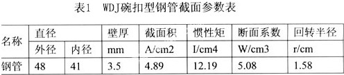 3.立桿驗算。WDJ碗扣型支架立桿按兩端鉸接的壓彎構件來計算。其鋼管截面參數見表1。