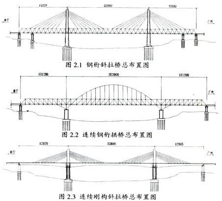 橋式方案應滿足通航和行洪要求,根據通航論證的最小凈寬要求,結合具體情況,進行了鋼桁斜拉橋、連續鋼桁拱橋和連續剛構斜拉橋三種橋式方案的研究。