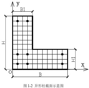 本文選取四組異形柱構件進行有限元分析。每組中有三根異形柱構件。這三根異形柱的截面尺寸、材料強度、配筋情況和加載點坐標完全一致。分別為未加固柱(注:此柱有試驗數據,詳見葛成元《鋼筋混凝土異形柱偏心受壓試驗及承載力計算研究》[1])、外包鋼加固的異形柱加固的異形柱。其中外包鋼加固的異形柱加固的異形柱加固用的角鋼均為6 根Q235等肢角鋼L45×5。外包鋼法加固異形柱后的截面如圖1-1: