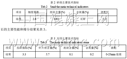 粗骨料選用的原則是強度高,連續級配好,低堿活性,并且同一顏色的碎石、產地、規格必須一致,而且含泥量小于1.5%,骨料不得帶雜物。細骨料選用中粗砂,細度模數在2.3 以上,顏色一致,其含泥量要控制在1.5%以內,泥塊含量要小于1%。[2]