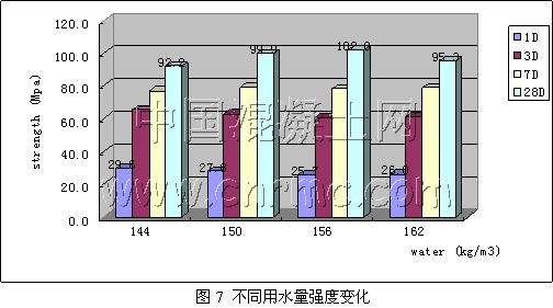 不同的混凝土用水量,通過調整外加劑的摻量達到基本相同的擴展度時進行比較,可發現當用水量為150公斤左右時,不僅混凝土的料比較松,易于施工,而且混凝土的強度也有一定的保證。