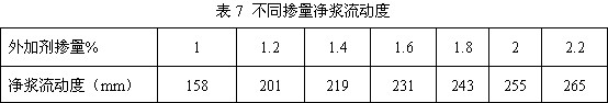 在選定水泥牌號的基礎上,我們對不同比例的膠凝材料用同摻量的SP-8進行了凈漿流動度比較。