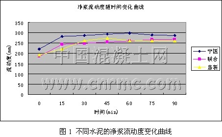 首先對在上海地區可能采用的嘉新京陽P.II52.5,聯合P.I52.5和寧國P.I52.5水泥進行比較,從需水量試驗和單純水泥的膠砂強度看,其差異不大,都比較好。從圖1的凈漿流動度試驗上,寧國水泥在初始略好于其他兩水泥;而且其與水泥的作用時間相對較快,可以減少實際生產過程中的攪拌時間。