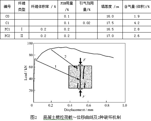 混凝土為C50。高爐礦渣微粉為膠凝材料總質量的40%。混凝土試件設計見表2所示。計算劈拉強度時,取劈拉荷載~位移全曲線第1峰值所對應的荷載,而非最大荷載,見圖2。