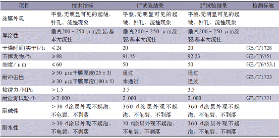 將表1成分1組成中的溶劑、助劑投入配漆杯中攪拌均勻,然后投入樹脂、顏料、填料,攪拌均勻,用砂磨機分散。試驗結果如表2所示,試驗表明1#、2#試驗配方產品生產工藝能夠保障生產無障礙。