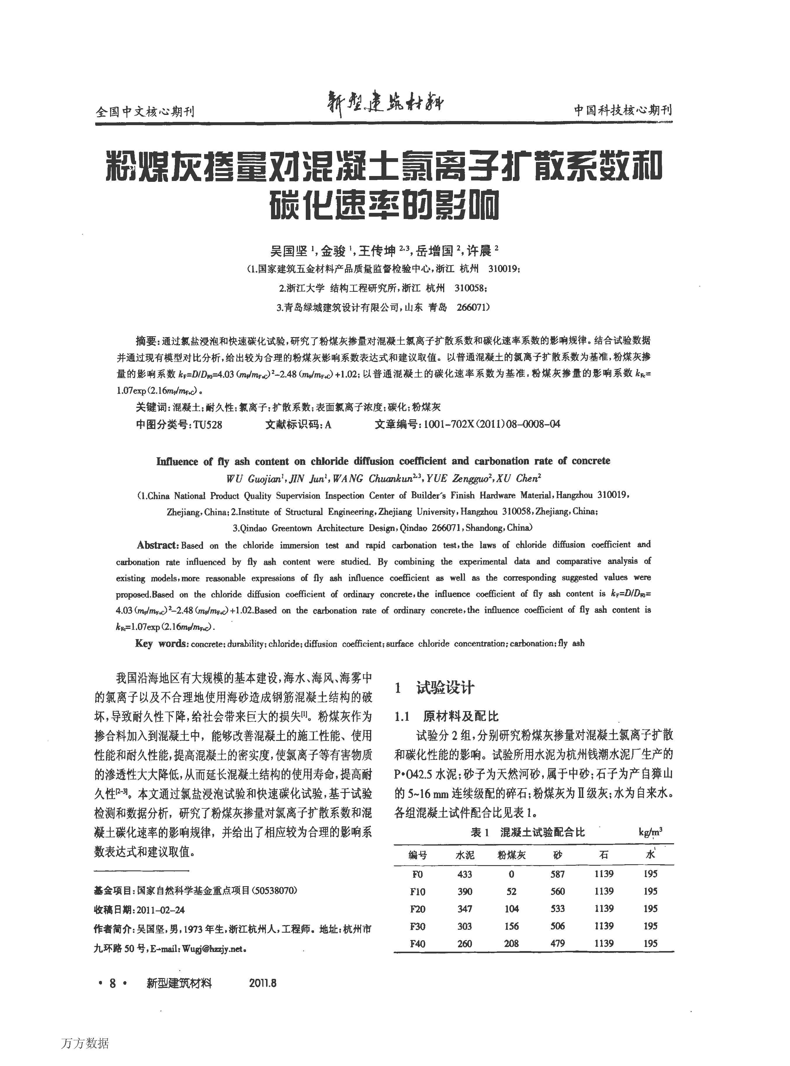 核心提示:通過氯鹽浸泡和快速碳化試驗,研究了粉煤灰摻量對混凝土氯離子擴散系數和碳化速率系數的影響規律.結合試驗數據并通過現有模型對比分析,給出較為合理的粉煤灰影響系數表達式和建議取值.以普通混凝土的氯離子擴散系數為基準,粉煤灰摻量的影響系數kF=D/DF0=4.03 (mF/mF+C)2-2.48 (mF/mF+C)+ 1.02:以普通混凝土的碳化速率系數為基準,粉煤灰摻量的影響系數kFc=1.07exp (2.16mF/mF+C).