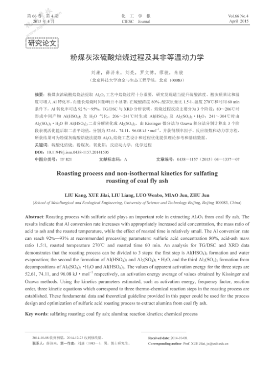 點擊下載全文:粉煤灰濃硫酸焙燒過程及其非等溫動力學