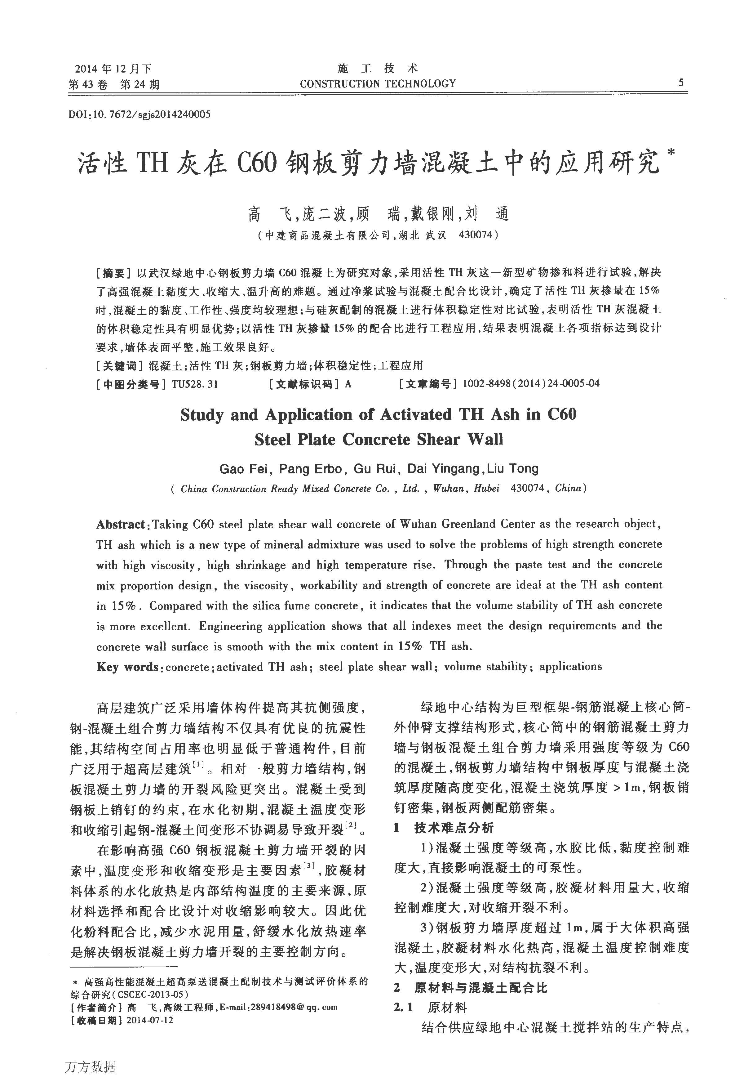 核心提示:以武漢綠地中心鋼板剪力墻C60混凝土為研究對象,采用活性TH灰這一新型礦物摻和料進行試驗,解決了高強混凝土黏度大、收縮大、溫升高的難題.通過凈漿試驗與混凝土配合比設計,確定了活性TH灰摻量在15%時,混凝土的黏度、工作性、強度均較理想;與硅灰配制的混凝土進行體積穩定性對比試驗,表明活性TH灰混凝土的體積穩定性具有明顯優勢;以活性TH灰摻量15%的配合比進行工程應用,結果表明混凝土各項指標達到設計要求,墻體表面平整,施工效果良好.