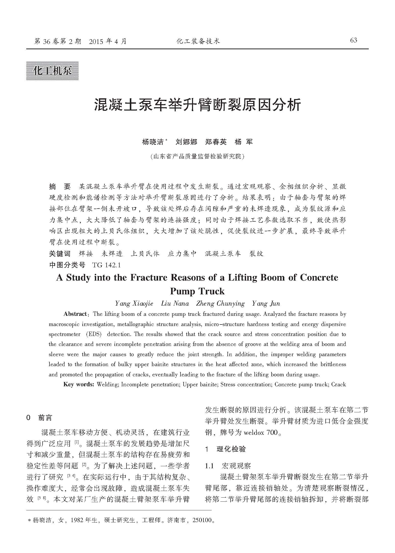 核心提示:某混凝土泵車舉升臂在使用過程中發生斷裂。通過宏觀觀察、金相組織分析、顯微硬度檢測和能譜檢測等方法對舉升臂斷裂原因進行了分析。結果表明:由于軸套與臂架的焊接部位在臂架一側未開坡口,導致該處焊后存在間隙和嚴重的未焊透現象,成為裂紋源和應力集中點,大大降低了軸套與臂架的連接強度;同時由于焊接工藝參數選取不當,致使熱影響區出現粗大的上貝氏體組織,大大增加了該處脆性,促使裂紋進一步擴展,最終導致舉升臂在使用過程中斷裂。