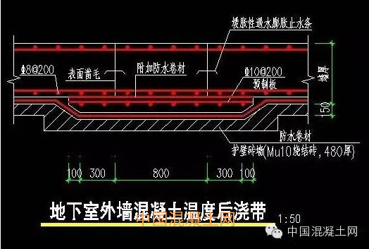 后澆帶的基本原理就是在建筑結(jié)構(gòu)的板和墻體施工中,分40m左右設(shè)置一條0.8~1m寬的混凝土施工縫,此處的鋼筋連續(xù)不斷,混凝土采用鋼板網(wǎng)片封堵。