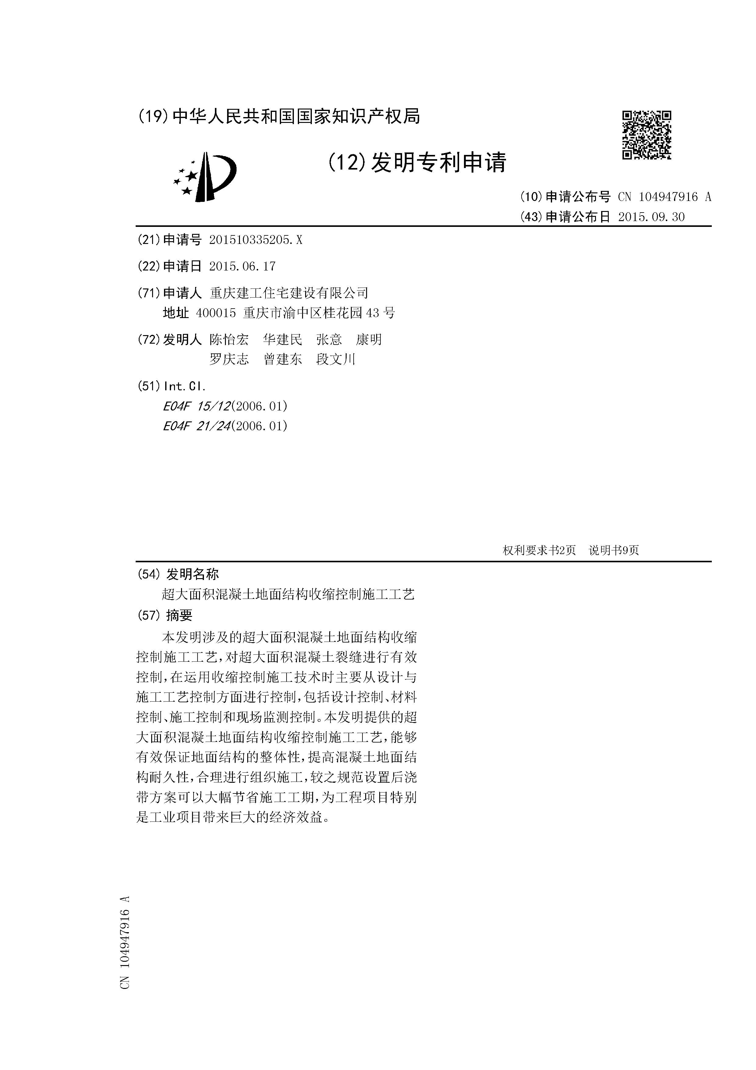 核心提示:本發明涉及的超大面積混凝土地面結構收縮控制施工工藝,對超大面積混凝土裂縫進行有效控制,在運用收縮控制施工技術時主要從設計與施工工藝控制方面進行控制,包括設計控制、材料控制、施工控制和現場監測控制。本發明提供的超大面積混凝土地面結構收縮控制施工工藝,能夠有效保證地面結構的整體性,提高混凝土地面結構耐久性,合理進行組織施工,較之規范設置后澆帶方案可以大幅節省施工工期,為工程項目特別是工業項目帶來巨大的經濟效益。