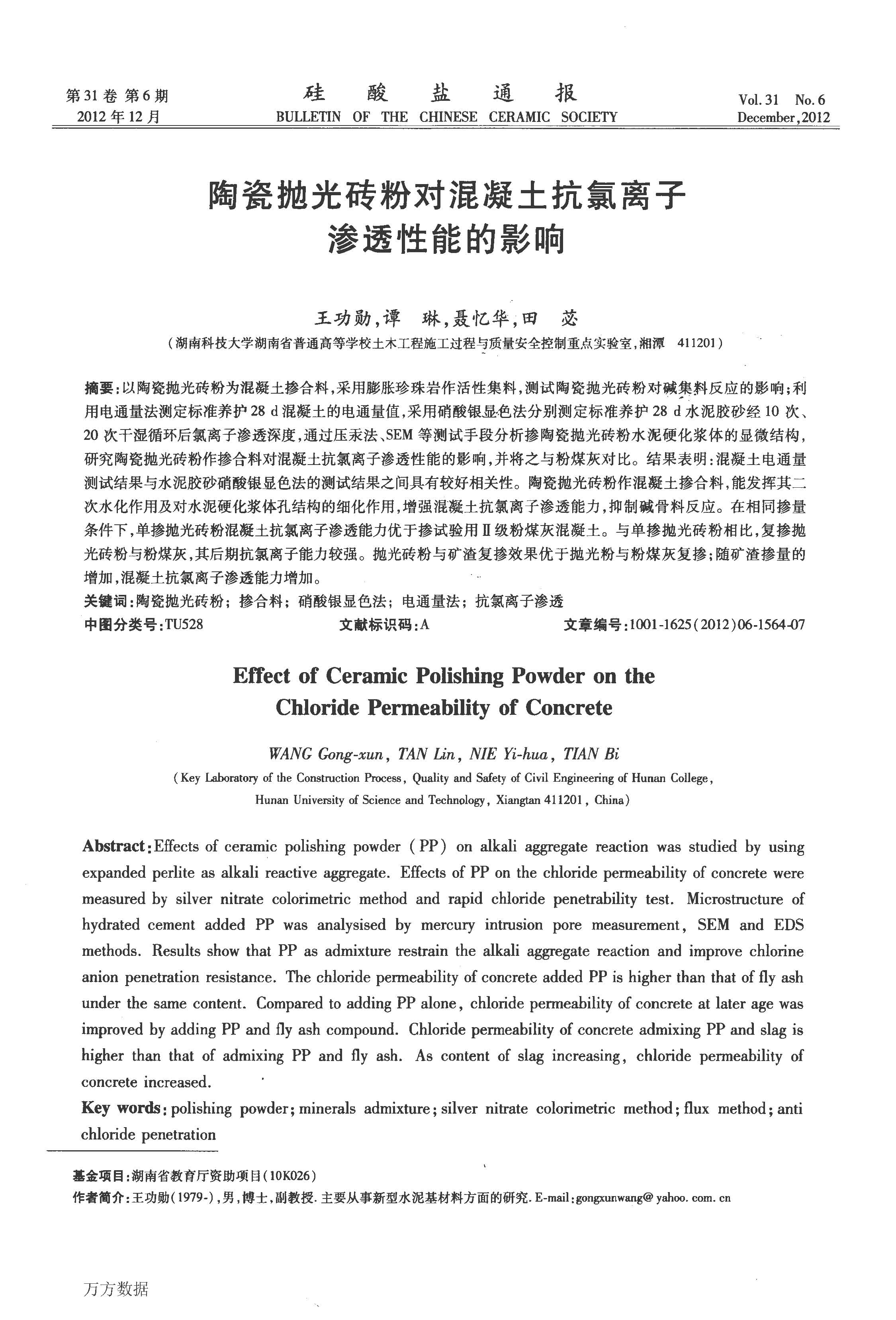 陶瓷拋光磚粉對混凝土抗氯離子滲透性能的影響