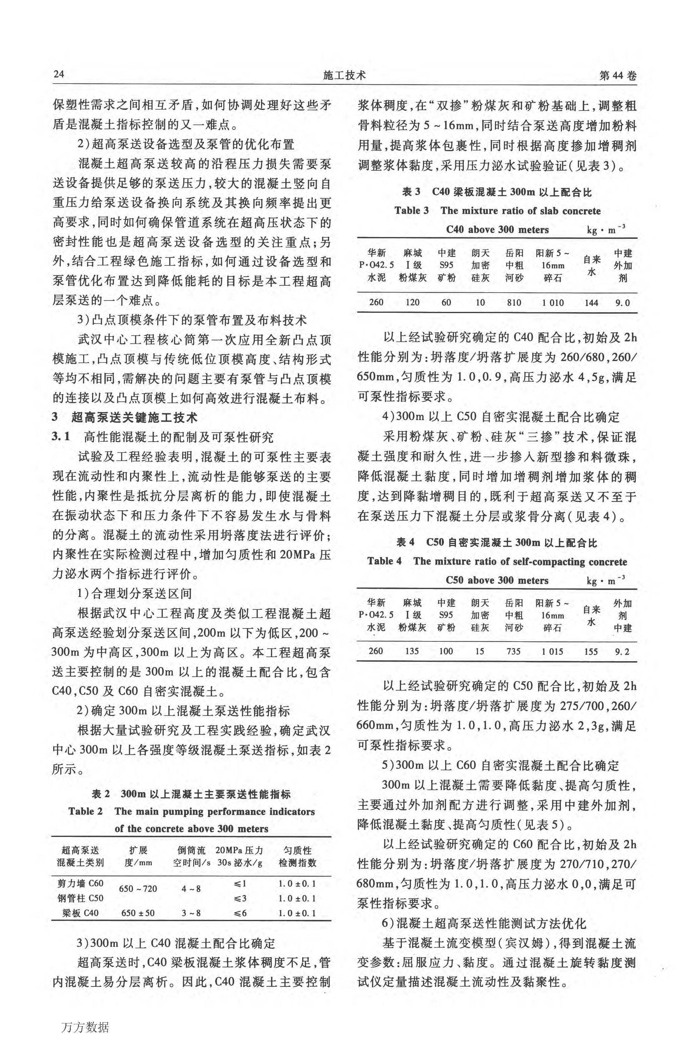 核心提示:混凝土泵送高度超過300m之后,混凝土泵送時間增長、泵送阻力增大,混凝土在高壓狀態(tài)下易出現(xiàn)離析堵管現(xiàn)象,高強高性能混凝土高黏度和良好流動性之間的矛盾、保塑性差與超高泵送高保塑性之間的矛盾越發(fā)凸顯.武漢中心工程C60自密實混凝土最大泵送高度為410.7m,混凝土性能指標確定和泵送系統(tǒng)的配置存在一定困難.以武漢中心工程為例,介紹了超高泵送關鍵施工技術,有效確保了混凝土可泵性.