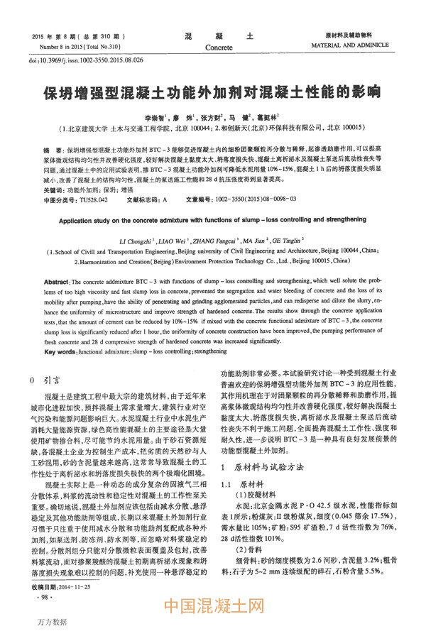 核心提示:保坍增強型混凝土功能外加劑BTC-3能夠促進混凝土內的細粉團聚顆粒再分散與稀釋,起滲透助磨作用,可以提高漿體微觀結構均勻性并改善硬化強度,較好解決混凝土黏度太大、坍落度損失快、混凝土離析泌水及混凝土泵送后流動性喪失等問題,通過混凝土中的應用試驗表明,摻BTC-3混凝土功能外加劑可降低水泥用量10%~15%,混凝土1h后的坍落度損失明顯減小,改善了混凝土的結構均勻性,混凝土的泵送施工性能和28 d抗壓強度得到顯著提高.