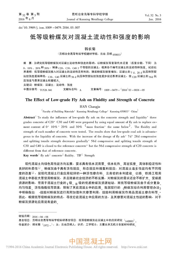 核心提示:為研究低等級粉煤灰對混凝土流動性和強度的影響,以粉煤灰等量取代水泥量(質量分數,下同)為0、10%、20%和30%,制備C20、C30、C40 3個等級的混凝土,檢測各個編號混凝土的流動性和強度。試驗結果表明:低等級粉煤灰摻入對混凝土的流動性是有利的,隨著粉煤灰摻量增加,混凝土的7 d、28 d抗壓和劈裂抗拉強度逐漸降低,C30、C40混凝土的56 d抗壓和劈裂抗拉強度逐步接近基準混凝土,但C20混凝土的56d抗壓強度與基準混凝土相差較大。