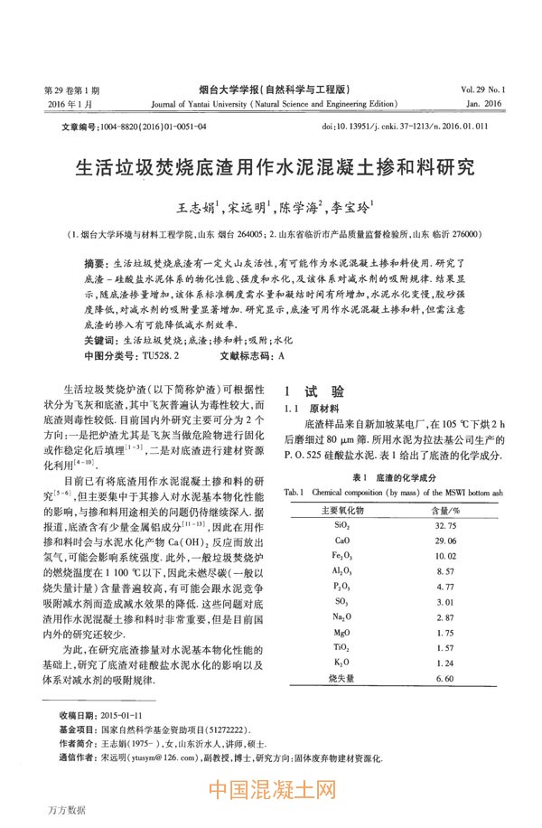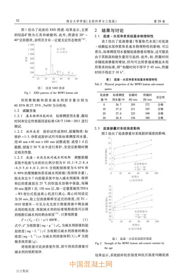 核心提示:生活垃圾焚燒底渣有一定火山灰活性,有可能作為水泥混凝土摻和料使用.研究了底渣-硅酸鹽水泥體系的物化性能、強度和水化,及該體系對減水劑的吸附規律.結果顯示,隨底渣摻量增加,該體系標準稠度需水量和凝結時間有所增加,水泥水化變慢,膠砂強度降低,對減水劑的吸附量顯著增加.研究顯示,底渣可用作水泥混凝土摻和料,但需注意底渣的摻入有可能降低減水劑效率.