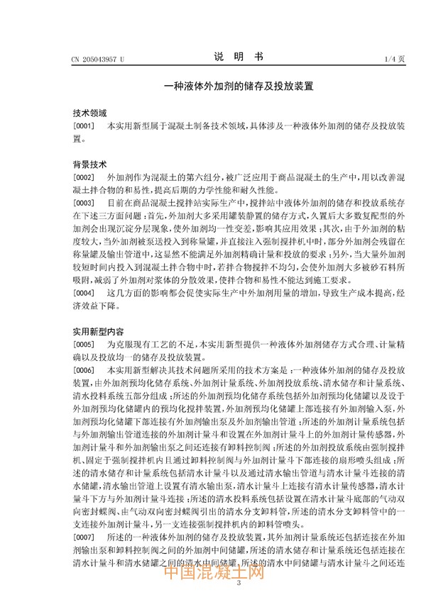 核心提示:本實用新型公開了一種液體外加劑的儲存及投放裝置,由外加劑預(yù)均化儲存系統(tǒng)、外加劑計量系統(tǒng)、外加劑投放系統(tǒng)、清水儲存和計量系統(tǒng)、清水投料系統(tǒng)五部分組成,本實用新型不僅解決了混凝土外加劑靜置儲存易沉淀變質(zhì)的問題,而且避免了投放外加劑時攪拌不均勻現(xiàn)象,在更換外加劑時避免了清水洗稱的流程,間接節(jié)約減水劑用量,降低整個工序流程的成本,優(yōu)化商品混凝土的生產(chǎn)工藝,具有儲存方式合理、計量精確以及投放均一等優(yōu)點。