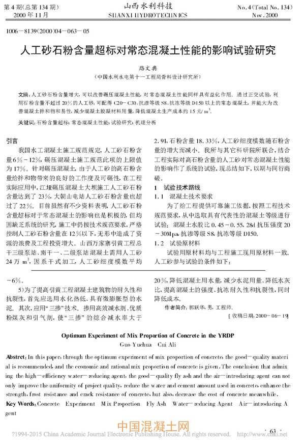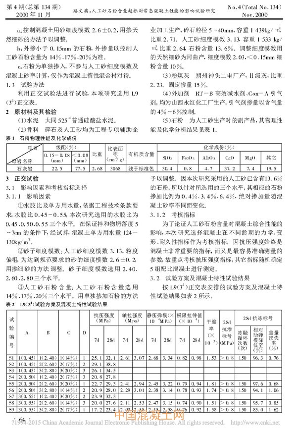 核心提示:人工砂石粉含量增大 ,可以改善碾壓混凝土性能 ,對常態混凝土性能同樣具有益化作用。通過正交試驗 ,利用石粉含量不超過 2 0 %的人工砂 ,可配得C2 0 -C30、抗滲等級S8、抗凍等級D15 0以上的常態混凝土 ,并能大為改善混凝土拌和物和易性 ,減少混凝土膠凝材料用量 ,降低混凝土生產成本約 15元 /m3。