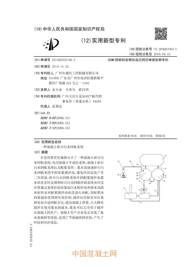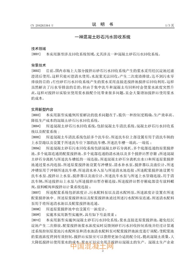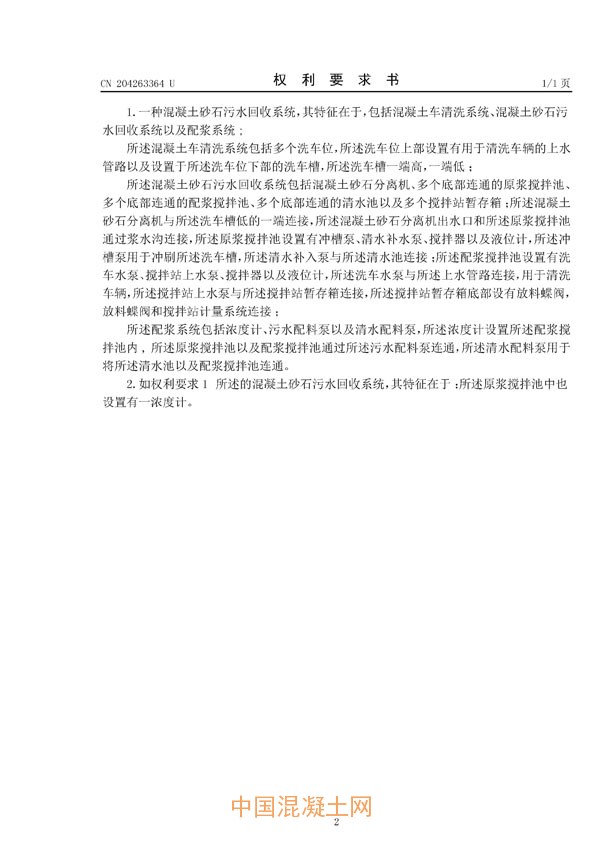 核心提示:本實用新型實施例公開了一種混凝土砂石污水回收系統,包括混凝土車清洗系統、混凝土砂石污水回收系統以及配漿系統;漿水直接進砂石污水回收系統中的原漿攪拌池,避免經沉淀池產生二次排放,砂石污水回收系統中的配漿攪拌池漿水濃度實時反饋到砂石污水回收控制系統并經過計算通過系統控制原漿池污水配料泵和清水池清水配料泵對配漿攪拌池濃度進行調配,使配漿池的漿液濃度得到有效控制,攪拌站實驗室可以獲得更加合適的配合比,提高混凝土質量,大大降低攪拌站使用漿水的成本,漿水可以完全用于攪拌站混凝土的生產。混凝土生產企業真正實現了廢水廢渣