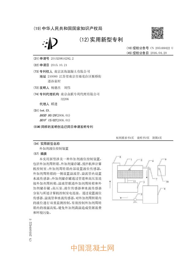 核心提示:本實用新型涉及一種外加劑液位控制裝置,包括外加劑周轉箱、外加劑儲存罐、攪拌機和計算機控制室;外加劑周轉箱內(nèi)部設置液位傳感器,外加劑周轉箱的一側設置溢流管,溢流管內(nèi)設置水流傳感器;外加劑儲存罐通過管道和高壓泵連接外加劑周轉箱,溢流管聯(lián)通外加劑周轉箱和外加劑儲存罐;高壓泵、液位傳感器和水流傳感器分別與所述計算機控制室電連接。通過設置液位傳感器、溢流管和水流傳感器,對外加劑周轉箱內(nèi)的液位進行雙重監(jiān)測控制,有效控制外加劑周轉箱內(nèi)的液面高低,避免外加劑滿溢造成資源浪費和環(huán)境污染。