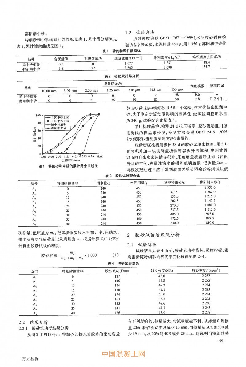 核心提示:通過膠砂試驗,測試細度模數0.6的特細砂以不同摻量取代天然中砂時對膠砂流動度、強度和密度的影響.發現特細砂摻量在20%左右時,其45~160 μm的微細顆粒有效彌補了骨料和膠凝材料顆粒級配的斷檔,使其具有的微集料效應,對膠砂的性能起著積極的作用.以上述試驗得出的特細砂最佳摻量作為參考,應用在泵送混凝土配合比設計中,驗證了在C30混凝土中特細砂替代天然中砂的最佳摻量為20%左右;強度等級低于或高于C30時,隨著混凝土中膠凝材料的減少和增加,適當增加和減少特細砂的摻量.