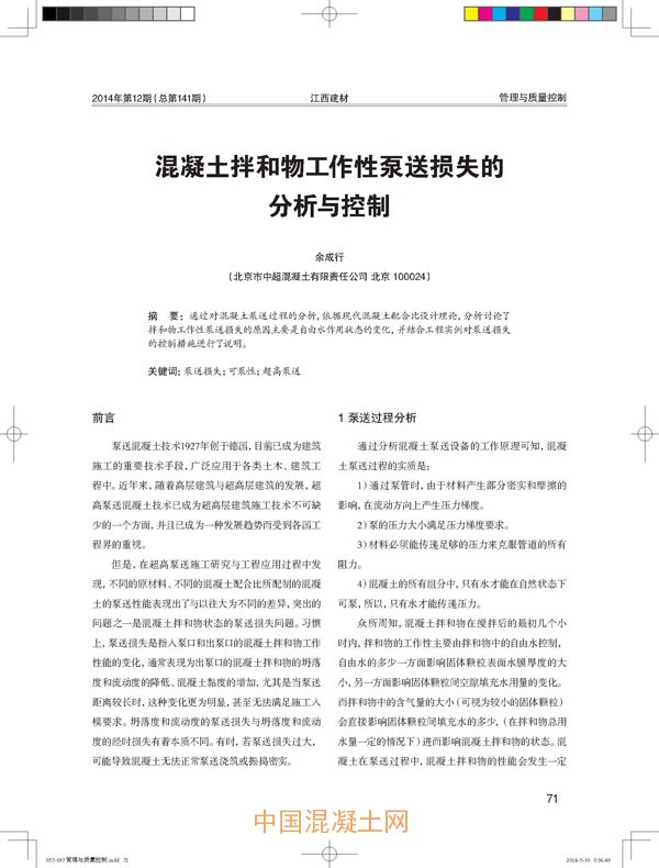 點擊下載全文:混凝土拌和物工作性泵送損失的分析與控制
