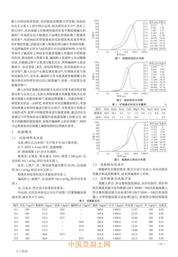 核心提示:采用雙層箍筋約束高強混凝土提高框架柱的承載力和抗震性能,具有重要的應用前景.相較于普通的鋼筋混凝土結構,采用雙層箍筋,增加了鋼筋的密度,對約束混凝土的施工性能提出了嚴格的要求.配制的混凝土不僅要滿足強度要求,而且還要流動性大,黏聚性好,勻質性高,石子的粒徑小,才能使混凝土均勻地穿過雙層箍筋,達到外層的保護層,形成致密的混凝土結構.選用粉煤灰、硅灰、偏高嶺土作為混凝土摻合料,進行細石高強混凝土配合比設計,討論不同摻合料高強混凝土的強度發展規律以及它們的對比分析.