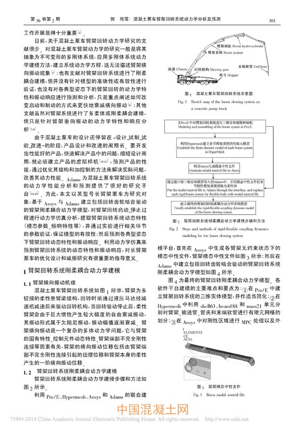 核心提示:針對混凝土泵車臂架回轉系統的振動性能,基于多體動力學理論建立包括回轉齒輪嚙合驅動的臂架剛柔耦合動力學模型,對其動態特性和振動響應進行動力學預測分析。動力學仿真求解和試驗測試結果表明,仿真模型與試驗樣機的固有頻率誤差為4%左右,阻尼比誤差為13%,臂架末端橫向振動位移曲線基本吻合,驗證了動力學模型和仿真結果的準確性和有效性。通過對典型姿態下臂架回轉系統的動力學預測,得到臂架在水平、弓形和L 形姿態下的末端橫向振動位移的最大幅值分別為1 300 mm、980 mm 和244 mm; 振動衰減時間分別為50 s