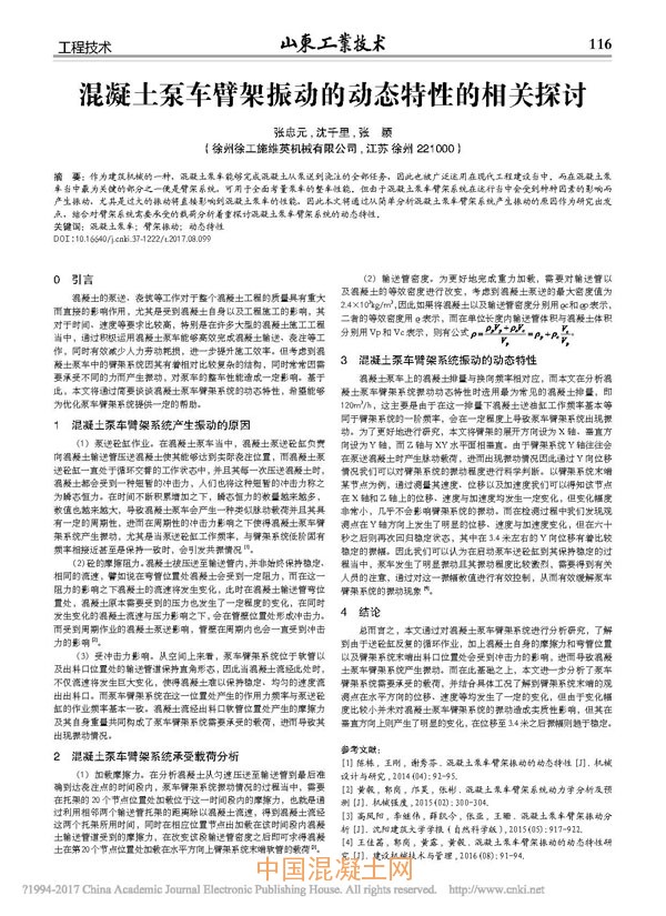 核心提示:作為建筑機械的一種,混凝土泵車能夠完成混凝土從泵送到澆注的全部任務,因此也被廣泛運用在現代工程建設當中。而在混凝土泵車當中最為關鍵的部分之一便是臂架系統,可用于全面考量泵車的整車性能。但由于混凝土泵車臂架系統在運行當中會受到種種因素的影響而產生振動,尤其是過大的振動將直接影響到混凝土泵車的性能,因此本文將通過從簡單分析混凝土泵車臂架系統產生振動的原因作為研究出發點,結合對臂架系統需要承受的載荷分析著重探討混凝土泵車臂架系統的動態特性。