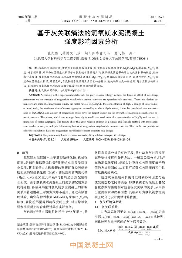 核心提示:根據(jù)已有試驗(yàn)數(shù)據(jù),借助灰關(guān)聯(lián)熵分析的手段,定量分析了輕燒粉用量、MgO/MgCl2 摩爾比、MgCl2 濃度、減水劑用量、砂率和粗骨料最大粒徑等對氯氧鎂水泥混凝土7d 抗壓強(qiáng)度性能影響的主次關(guān)系和影響程度。經(jīng)分析計(jì)算得出:對氯氧鎂水泥混凝土抗壓強(qiáng)度影響最大的是MgO/MgCl2 摩爾比和輕燒粉用量,其次為砂率、MgCl2 濃度和粗骨料最大粒徑。