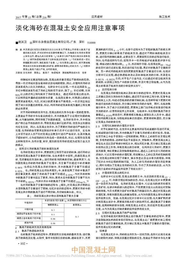 核心提示:本文通過比較現行國家規范及行業標準關于混凝土用砂最大氯離子含量的相關規定,并對河砂市場資源枯竭情況下,為確保淡化海砂在混凝土安全應用,提出幾點注意事項:(1)認真學習和嚴格執行相關標準和規范;(2)采用快速檢測氯離子法和完善監控措施;(3)與機制砂按一定比例搭配混合使用,降低氯離子含量;(4)優化混凝土配合比,采用聚羧酸高效減水劑和雙摻粉煤灰和礦粉,提高海砂混凝土的耐久性;(5)對新拌混凝土氯離子進行嚴格、及時的檢驗。