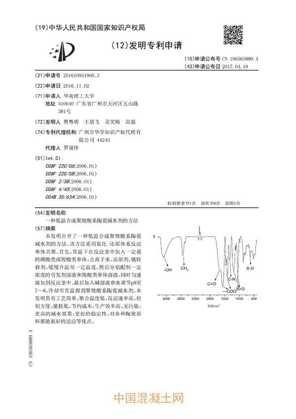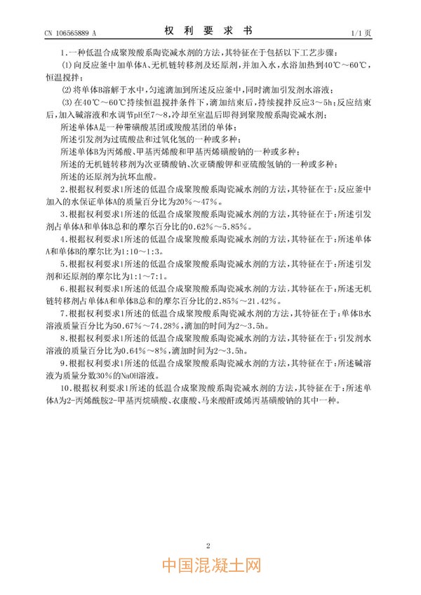 一種低溫合成聚羧酸系陶瓷減水劑的方法(公開號:CN106565889A)