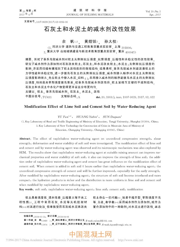 核心提示:測試了萘系高效減水劑對軟土無側限抗壓強度、抗剪強度、壓縮性和水穩定性的改性效果,研究了減水劑作為添加劑對石灰改良軟土(石灰土)和水泥改良軟土(水泥土)無側限抗壓強度的影響,并采用掃描電鏡觀測了軟土改性前后的微觀結構.結果表明:萘系高效減水劑能改善軟土的力學性能和水穩定性,進一步提高石灰土的無側限抗壓強度;減水劑摻入順序對水泥土無側限抗壓強度影響很大,先在軟土中摻入水泥,悶料6h后再摻入減水劑的順序能提高水泥土的無側限抗壓強度,特別是其早期強度提高顯著;經萘系高效減水劑改性后,軟土呈相互交錯的不規則結構,石